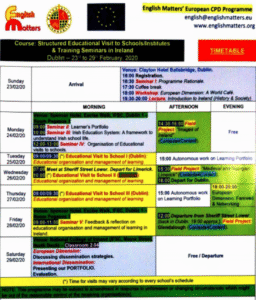 La jornada de hoy ha estado dedicada a conocer el sistema educativo de Irlanda, que es complejo pero está probado que es efectivo. Lo más novedoso desde nuestro punto de vista es que existe un año de transición que los estudiantes de secundaria tienen antes de a la universidad para elegir qué desean estudiar. También podemos destacar que tienen un currículum único para todo el país aunque haya diferentes tipos de escuelas.